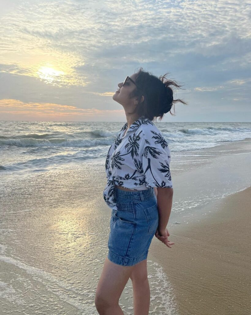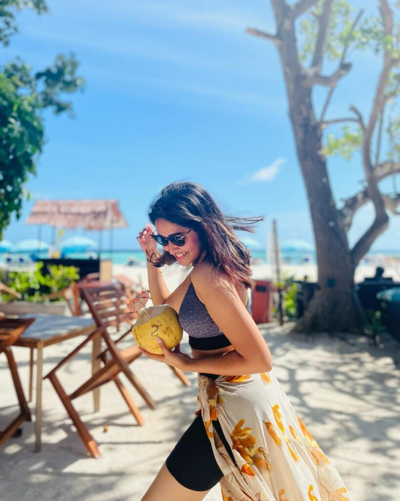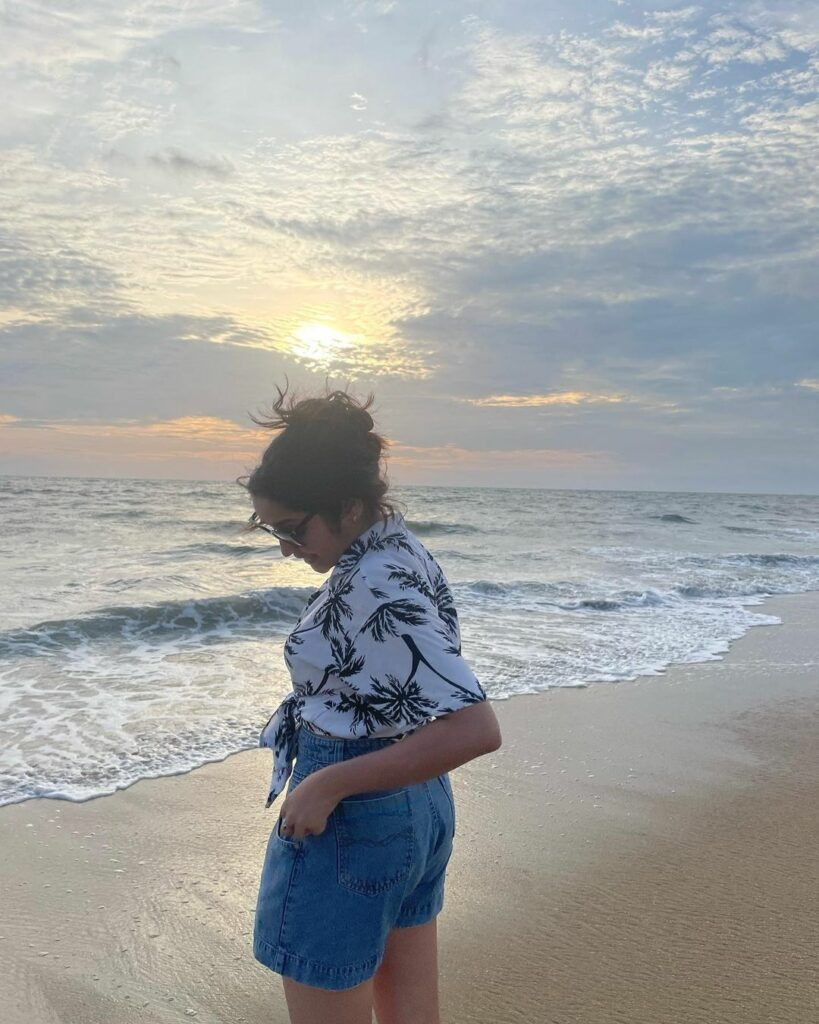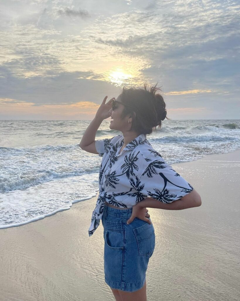 Anikha Surendran, an actress from Butta Bomma, recently went on vacation to the maldives and made sure to make it gorgeous. Her beach outfit of a grey bra, black shorts, and a yellow and white wrap around her waist boosted the glam factor. The three things combined to produce a sensual but fashionable style that is ideal for any beach vacation.
