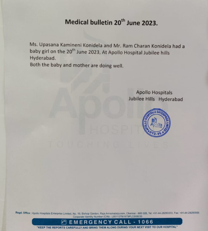 Ram Charan and his darling wife, upasana Kamineni became proud parents of a baby girl on june 20, 2023. The newbie parents are overjoyed after being blessed with their first child and are all set to perform their new duties with their little ones. For the unversed, upasana got admitted to the Apollo Hospital on june 19, 2023, and later, the team of doctors issued a medical bulletin to announce the good news, adding that both upasana and her baby girl are doing fine.