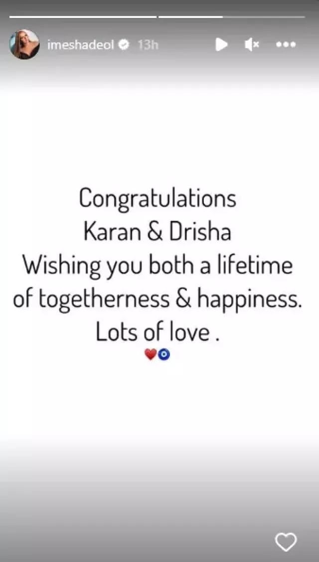 Esha Deol, the elder daughter of dharmendra and hema malini, shared a lovely post on her instagram account on june 20, 2023, wishing karan Deol, son of her half-brother sunny deol, for his wedding. Sharing an insta story, he wrote, "Congratulations karan and Drisha. Wish you a lifetime together and happiness."