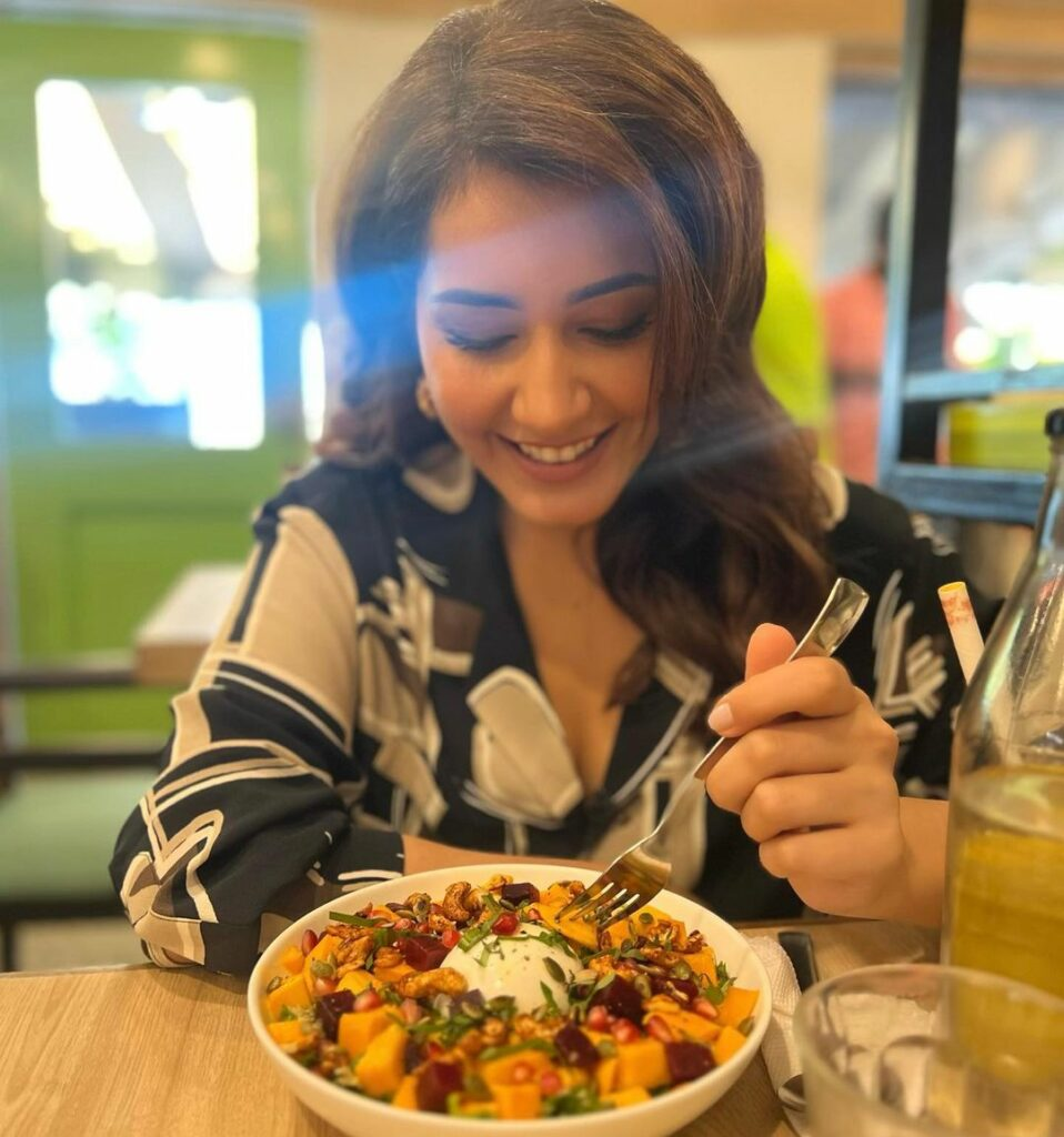In the entertainment business, Raashi has established herself as a well-known actor. Her love of eating is evident in the numerous photos on her instagram feed. Raashi prefers to open up about her indulgences with her fans, in contrast to other actresses who keep their diet plans a secret. She is a great gourmet at heart, enjoying everything from pizza to roasts, coffee to salad.