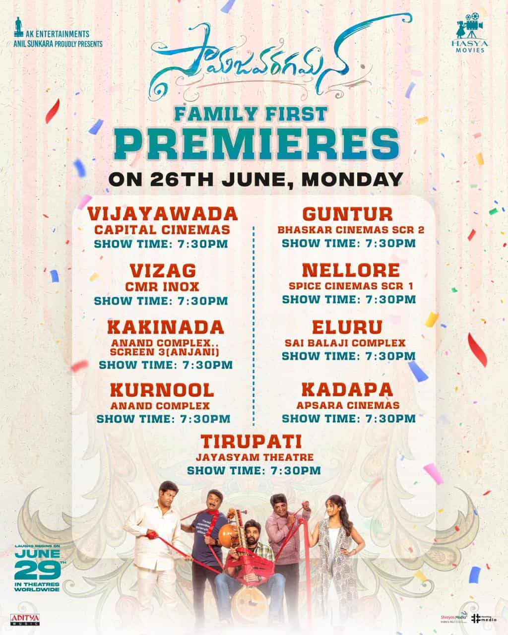 They think that by hosting these family-friendly premieres, the film would gain favourable publicity before it is released. The creators' strategy is fantastic. ram Abbaraju directed Samajavaragamana, which was marketed as pure entertainment. On the 29th of this month, the film directed by Anil sunkara and produced by Razesh Danda is scheduled for release.