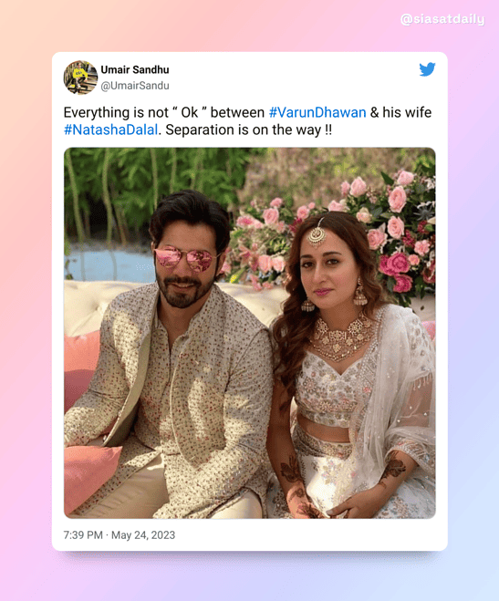 The bollywood pair varun dhawan and natasha Dalal is one of the most adored. In january 2021, in front of a small gathering of their close friends and family, they exchanged vows. Thoughts concerning the status of their marriage have recently been raised in response to a tweet by well-known critic Umair Sandhu.