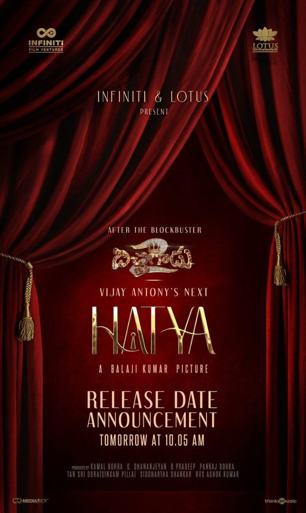 ఇది ఇలా ఉంటే బిచ్చగాడు మూవీ సూపర్ సక్సెస్ కావడంతో తాజాగా ఈ నటుడు బిచ్చగాడు 2 అనే మూవీ ని తలకెక్కించాడు. ఈ మూవీ లో విజయ్ ఆంటోనీ హీరోగా నటించగా ... కావ్య తప్పర్ ఈ సినిమాలో హీరోయిన్ గా నటించింది. కొన్ని రోజుల క్రితమే విడుదల అయిన బిచ్చగాడు 2 మూవీ టాలీవుడ్ బాక్స్ ఆఫీస్ దగ్గర మంచి విజయం సాధించింది. ఇది ఇలా ఉంటే ఈ నటుడు ప్రస్తుతం హత్య అనే సస్పెన్స్ థ్రిల్లర్ మూవీ లో హీరో గా నటిస్తున్నాడు. ఇది ఇలా ఉంటే తాజాగా ఈ మూవీ బృందం ఈ సినిమాకు సంబంధించిన ఒక అప్డేట్ ను ప్రకటించింది.