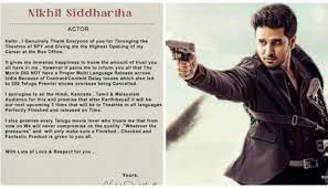 Hero Nikhil apologised to the Hindi, Kannada, Tamil, and malayalam audiences on twitter this morning for not releasing the movie correctly on a national level. He added that all three of his next films would receive extensive screenings. Nikhil tweeted an apology, and it appears that he specifically faulted the Spy teams for the hurried release and failure in his post.