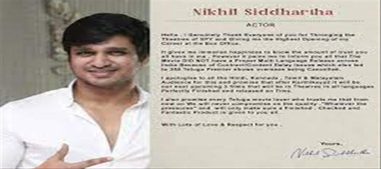 The telugu audience was also given a pledge by Nikhil that the quality of its upcoming films would not be compromised at any cost and that they will be launched as legitimate pan-Indian pictures. According to him, quality would never be compromised going forward. No matter the circumstances, he promised, "we will always make sure that a finished, checked-out, and magnificent work is presented to you all (in the original)." Nikhil has a tonne of forthcoming projects, including the films "Swayambu" and "India House". Films like "Swayambu" and "India House" are among Nikhil's many upcoming projects. Following Nikhil's remark, numerous online commenters began to claim that the protagonists now frequently blame the film's team when box office results are poor.