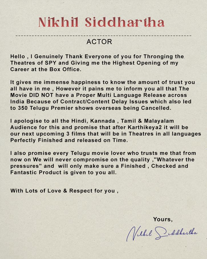 Hero Nikhil sent an open letter about "SPY" in which he apologised to the viewers but did not label the movie a failure. However, he made it clear that he would never, under any circumstances, sacrifice quality. Everyone then started talking about the pressure Nikhil was under to make this movie as a result.