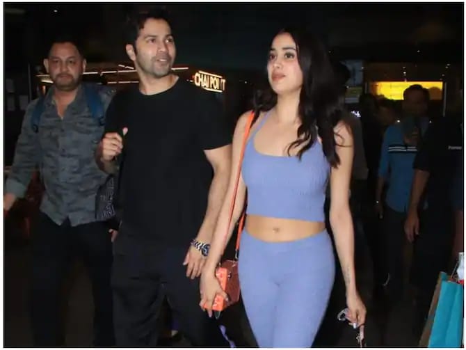 Manav Mangalani has shared the video of jahnavi Kapoor and varun Dhawan's mumbai airport on his instagram page. In which the actress is seen in a blue-colored crop top with matching trousers. She has complemented her look with open curly hair and nude makeup. While varun dhawan was looking quite handsome in the all-black look.