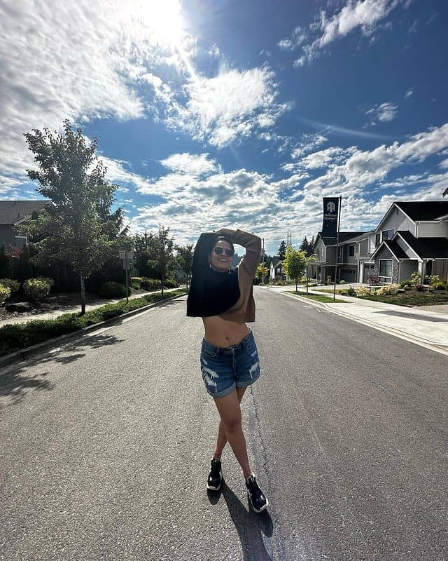 The well-known anchor and actress anasuya has been touring the united states and delighted her followers with gorgeous photos. She can be seen wearing a full-sleeved black blouse and tattered denim shorts in one of her most recent images. However, it was the way she sexily exposed her stomach and navel with assurance that everyone noticed. She chose a pair of athletic shoes to finish off her style by adding a sporty touch. Her followers are in awe of Anasuya's daring dress choices and exuding confidence.