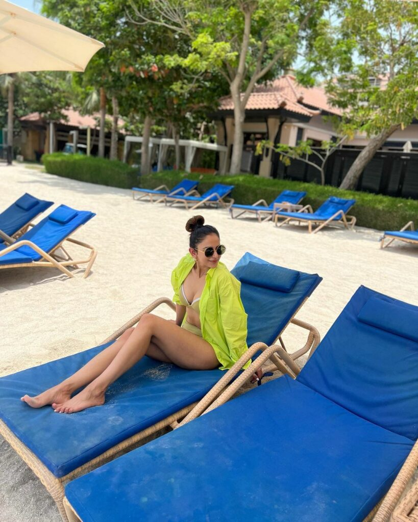 Rakul Preet Singh and her family took a vacation in dubai to get away from the hectic lifestyle of Mumbai. The celebrity has shared a number of photos from dubai that provide a taste of her stay there. Rakul's holiday attire also impressed her admirers, and you might take some inspiration for your upcoming vacation. For instance, her most recent image shows her lounging on the beach with a green bikini suit and an oversized top. It gave beachwear a little bright enchantment.
