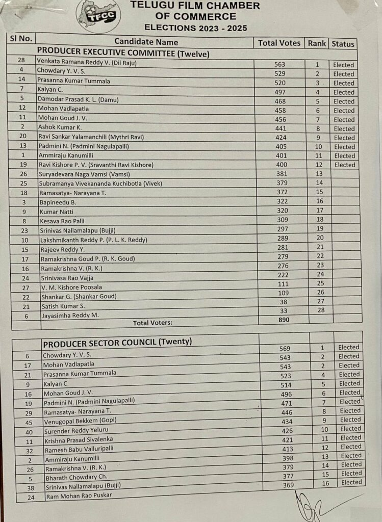 Dil Raju's panel received 563 votes in 14 rounds, while C Kalyan's panel received 497. Suryadevara naga Vamsi (Sithara Entertainments), Bapineedu (SVC Entertainments), and vivek Kuchibhotla (Peoples media Factory), three well-known producers, unexpectedly lost the election. Dil Raju currently has a total of seven of the twelve producers' sector seats. Several of dil Raju's panellists, including prasanna Kumar, YV Chaudhary, ashok Kumar, Padmini, Sravanti Ravikishore, Yalamanchali Ravishankar, Damodara Prasad, and Mohan Vadlapatla, all won their respective seats in the producer sector.