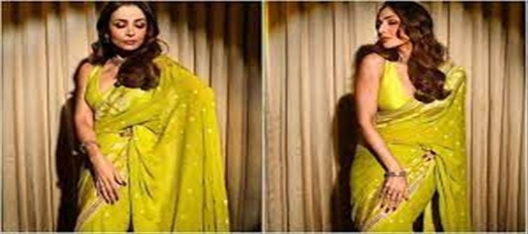 Malaika Arora shared photos of herself on instagram today wearing a stunning green saree designed by renowned fashion designer Anita Dongre. She wore a Banarasi silk drape decorated with sequins, hand-embroidered gold brocade, and cutdana work. She wore it conventionally, with front pleats and a pallu that hung from her shoulder.