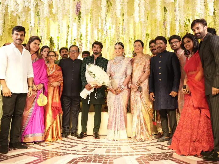 Ram Charan and upasana, seen together for the first time after becoming parents, attended the reception of Brahmanandam's son