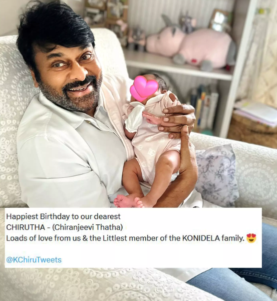 However, ram Charan's comment became the highlight. chiranjeevi was changed to Charan Cheetah in the caption. Cheetah means little grandfather. megastar chiranjeevi is celebrating his 68th birthday today. On this occasion, movie stars, celebrities, and fans are congratulating him on social media platforms. In this sequence, Chiranjeevi's beloved granddaughter expressed her best wishes in a variety of ways. Chiranjeevi's only son ram charan recently became a father. His daughter was born to him. The baby was also named Klinkara. ram charan shared a photo of chiru picking up Klinkara today on the occasion of Chiru's birthday. In that photo, Klinkara's face was covered. However, ram Charan's comment became the highlight. chiranjeevi was changed to Charan Cheetah in the caption. Cheetah means little grandfather. On behalf of the youngest daughter in their family, Charan wished her father on his birthday. Charan's first film is Cheetah. Giving it to his father has impressed the fans tremendously. It seems that ram charan, who was on vacation until recently, has recently started shooting for Game Changer. shankar is directing this movie. kiara advani and anjali are playing the heroines. After this, Charan Uppena will do another film under the direction of Buchi Babu. When it comes to chiranjeevi, he recently came in front of the audience with Bhola Shankar's movie. Directed by Meher Ramesh, this movie did not impress much. chiru has two more films in hand. They are likely to start shooting soon. One will be directed by kalyan krishna of Bangarraju fame. Remarkably, Chiru's first daughter Sushmita is undertaking the production duties of this film.