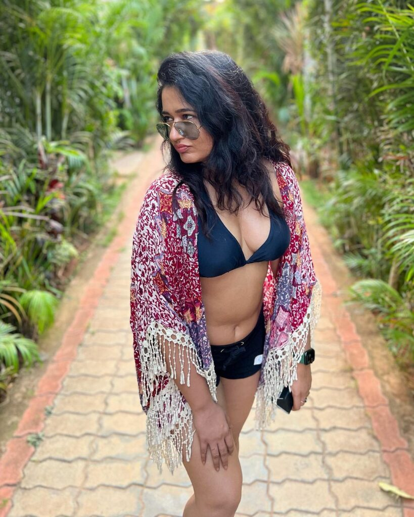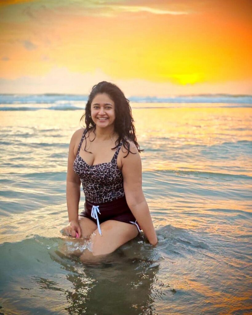 The photo displays Poonam Bajwa's natural sense of style. Her decision of an animal print camisole, which is now in style, combines well with the sea in the background. Her outfit, which she paired with beautiful yet subtle black shorts, is proof of her sense of style. Her beautiful scene in the water overcomes age and body image limitations. She disobeys social conventions and provides a positive example that extends well beyond the world of fashion as she beautifully revels in her individual style.