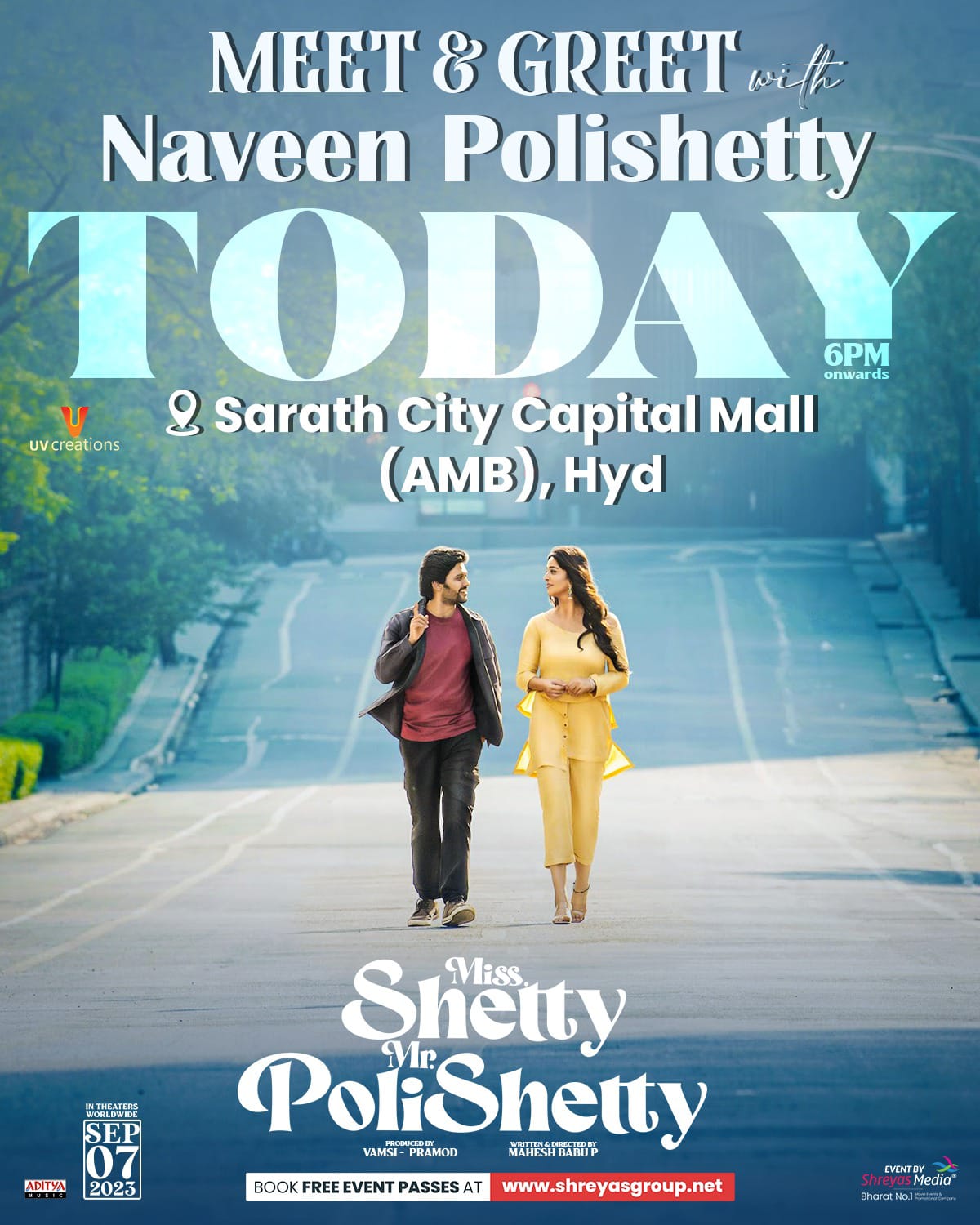 ఇకపోతే ఈ సినిమాను యూ వి క్రియేషన్స్ బ్యానర్ పై వంశీ , ప్రమోద్ లు నిర్మించారు. ఈ మూవీ ని సెప్టెంబర్ 7 వ తేదీన థియేటర్ లలో విడుదల చేయనున్నారు. ఈ మూవీ విడుదల తేదీ దగ్గర పడడంతో ఈ సినిమాలో హీరోగా నటించినటువంటి నవీన్ పోలిశెట్టి వరుసగా ఈ మూవీ కి సంబంధించిన ప్రమోషన్ లను ఫుల్ జోష్ లో నిర్వహిస్తూ వస్తున్నాడు. అందులో భాగంగా ఈ రోజు కూడా ఈ నటుడు ఒక ఏరియాలో అదిరిపోయే రేంజ్ లో ప్రమోషన్ నిర్వహించబోతున్నాడు. ఇకపోతే ఈ రోజు సాయంత్రం 6 గంటలకు నవీన్ పోలిశెట్టి శరత్ సిటీ క్యాపిటల్ మాల్ "ఏ ఎం బి" హైదరాబాదులో జనాలతో ఇంటరాక్ట్ కానున్నట్లు ఈ మూవీ బృందం తాజాగా అధికారికంగా ప్రకటిస్తూ ఒక పోస్టర్ ను కూడా విడుదల చేసింది. ప్రస్తుతం ఈ పోస్టర్ సోషల్ మీడియాలో ఫుల్ వైరల్ అవుతుంది.