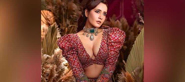Raashii Khanna has shared some glamorous pictures of her on social media from her latest magazine shoot. The Farzi actor took to her instagram handle to share photos of her in an embellished red lehenga with a plunging neckline accessorised with a heavy neckpiece adorned with a green emerald stone. She opted for a sleek open-hair alluring ook.