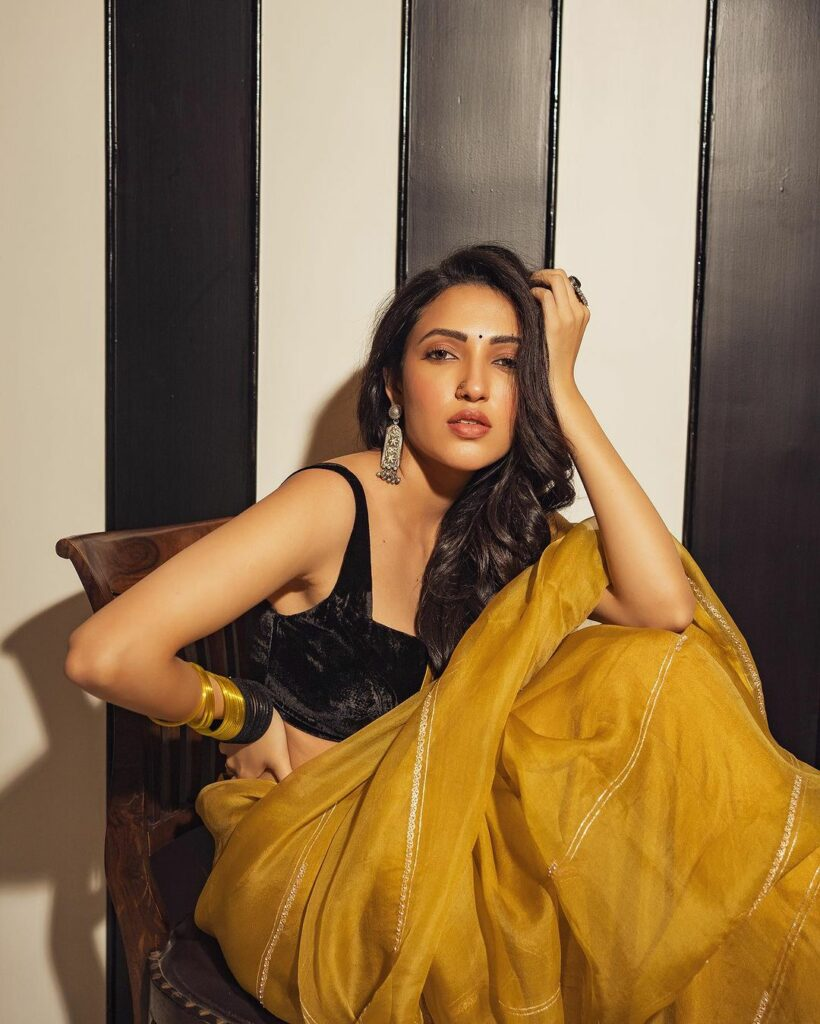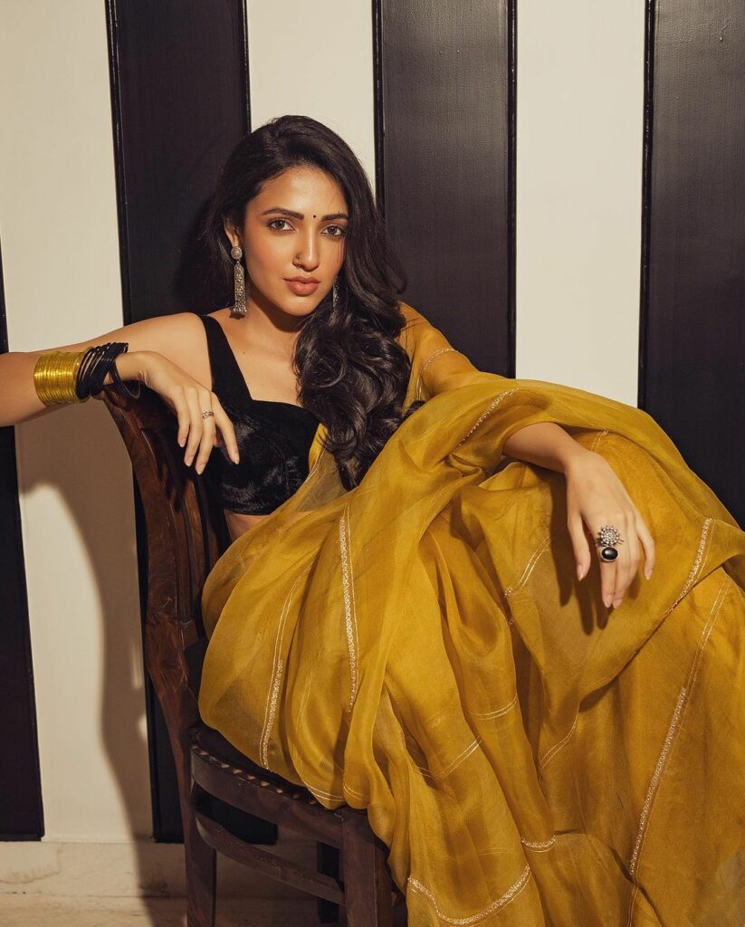 Attractive charm Neha Shetty, who will soon act alongside kiran Abbavaram in the movie "Rules Ranjann," radiates timeless beauty while gracing the camera in traditional costume. She wears a stunning yellow saree with a chic black sleeveless top for this mesmerising look. Her glowing complexion is complemented by the harmony of these colours, which makes her a sight to behold.