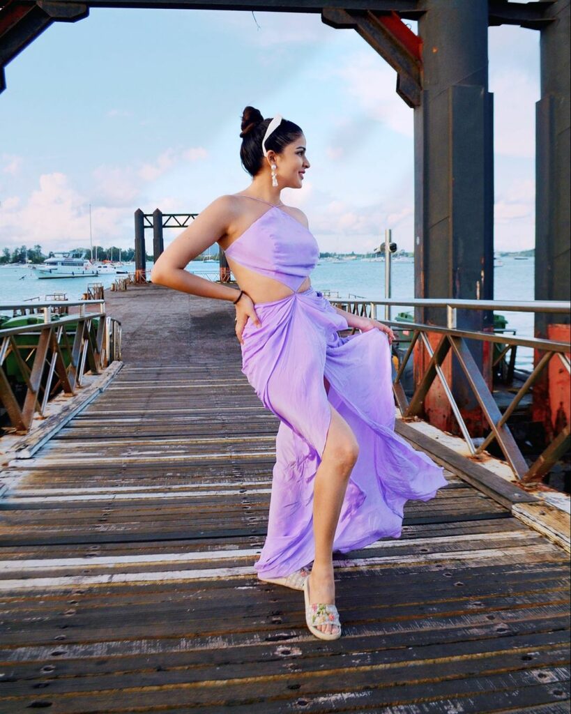 Lavanya Tripati is captivating as she adorns the lovely Maldivian beaches. Lavanya radiates elegance and beauty in her most recent vacation photos, which leave us in awe of her flawless sense of style. She displays her fashion sense with ease while wearing a purple cut-out dress that nicely emphasises her contours.