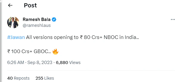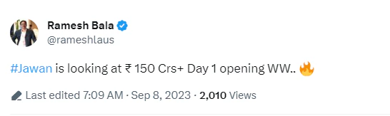 Jawan is already expected to do well at the box office. According to trade sources, 'Jawan' made Rs 75 crore in india on Day 1 across all languages. The movie's overall attendance on thursday in the hindi version was 58.67%. With 81 percent, chennai had the highest occupancy. In the meantime, trading expert Ramesh bala stated on X that "Jawan" is anticipating a Day 1 international opening of at least Rs 150 crore."