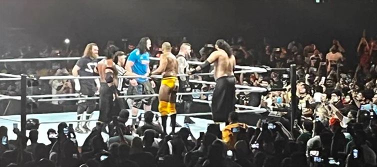 The indian audience began to applaud Zayn, Owens, and Drew McIntyre. Surprisingly, the audience has not shown any support for the indian wrestling champions Veer Mahan and Sanga. During his introduction, Drew McIntyre was wearing an indians jersey.