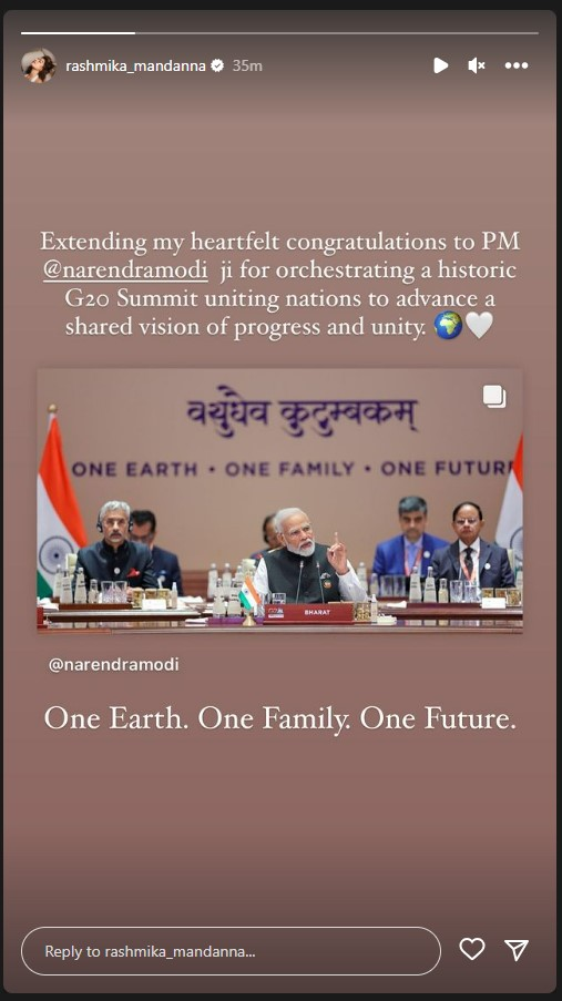 In addition to them, actress rashmika mandanna praised PM Modi. "Extending my heartfelt congratulations to PM @narendramodi ji for orchestrating a historic G20 summit uniting nations to advance a shared vision of progress and unity," the "Pushpa" star posted on her instagram stories. One Family. One Future. One Earth.