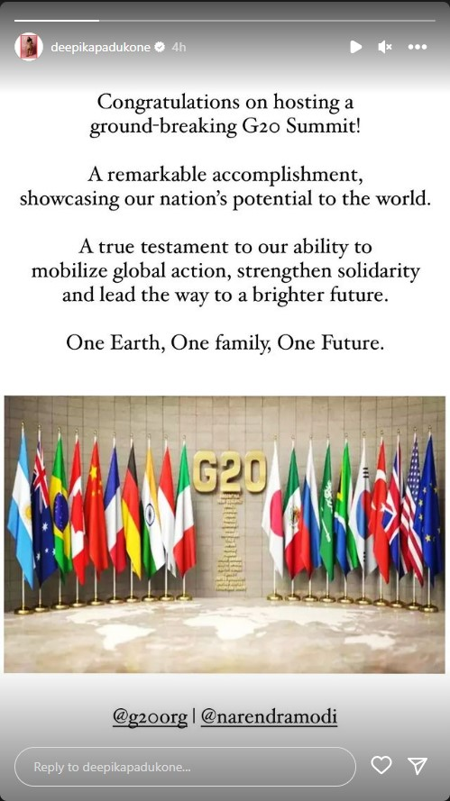 On Tuesday, actors rashmika mandanna, deepika Padukone, and sidharth malhotra congratulated prime minister Narendra Modi on the achievement of India's G20 presidency. Congratulations for hosting a historic G20 summit, deepika commented on instagram as she uploaded a picture on her stories. A tremendous feat that shows the world the potential of our country. A real demonstration of our capacity to spur international cooperation, bolster solidarity, and pave the road for a better future. One planet. One Future. One Family.