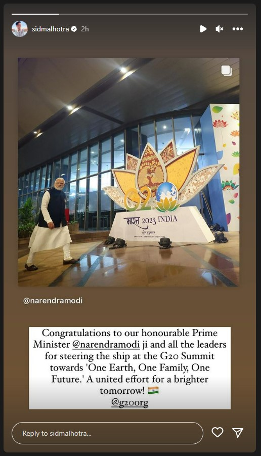 Congratulations to our honourable prime minister @narendramodi ji and all the leaders for guiding the G20 conference towards "One Earth. One Family. One Future," sidharth malhotra said in a post he posted on his stories. Unified endeavour for a better future.
