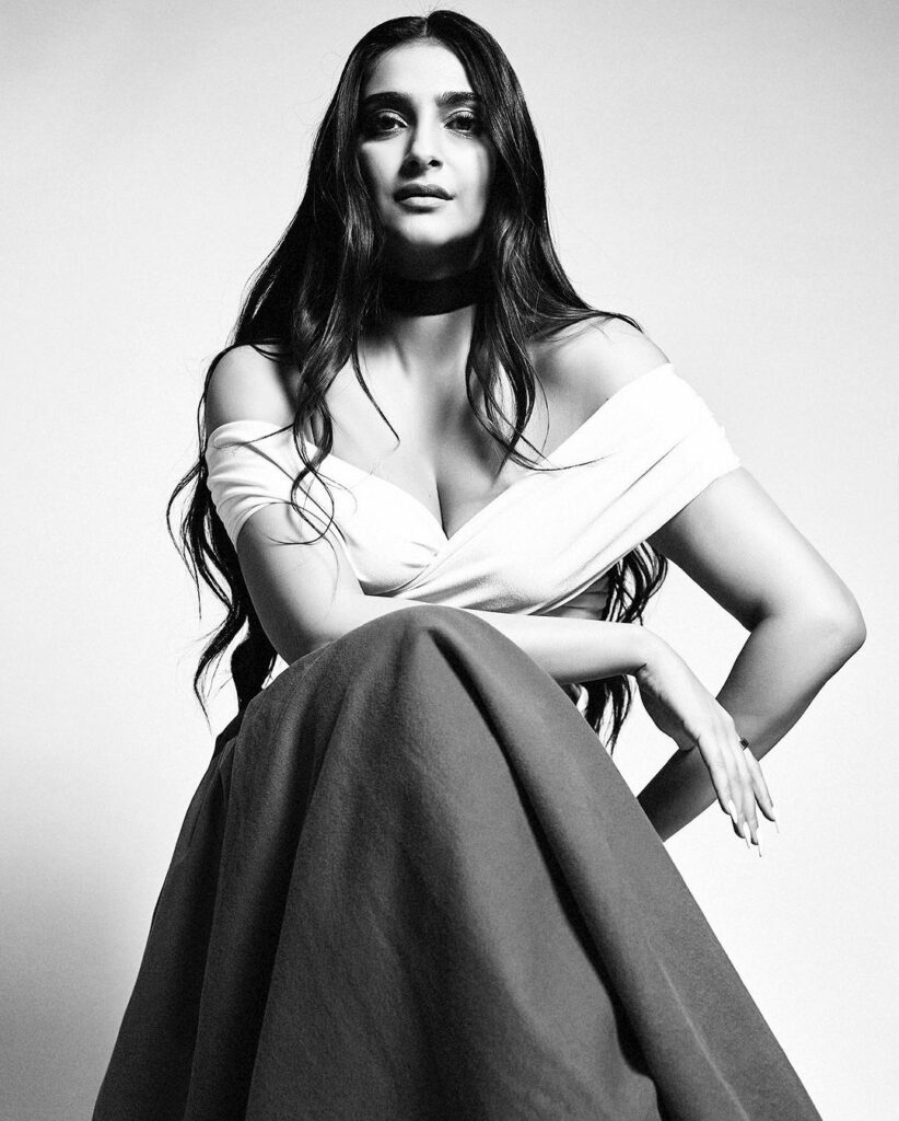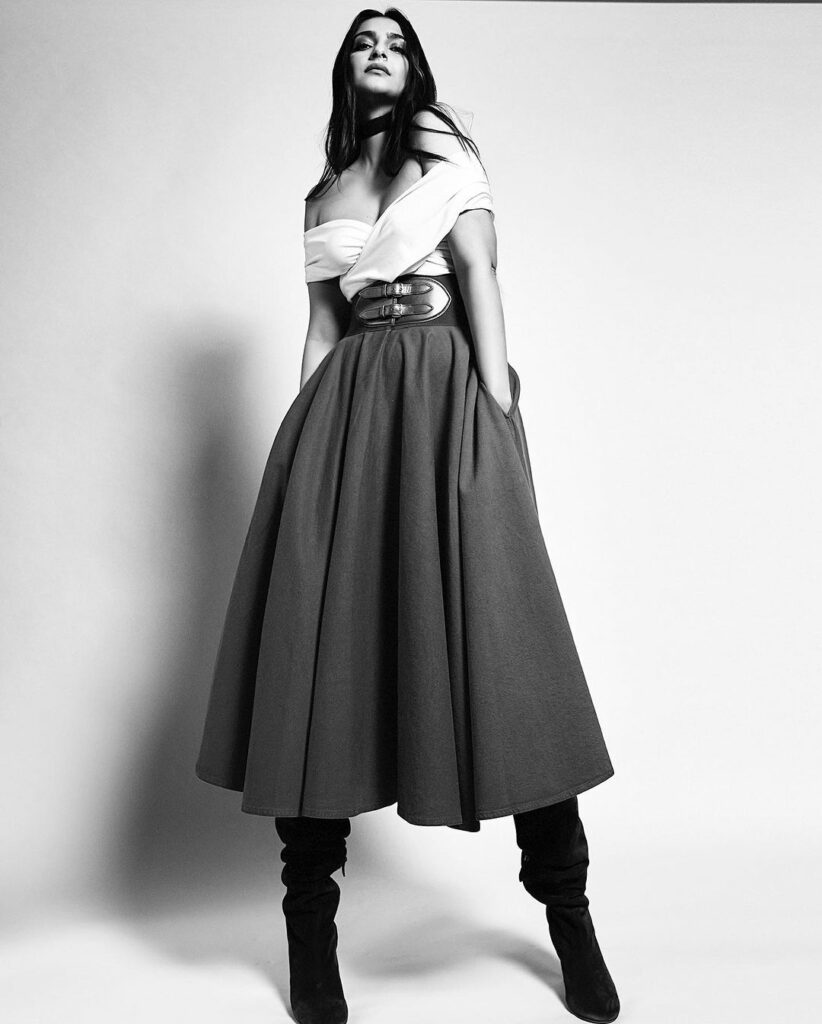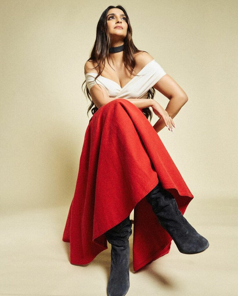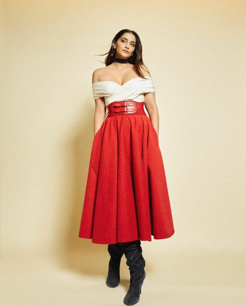 Sonam Kapoor, a well-known fashionista in Bollywood, never fails to astound her admirers with her appearances in public. She may have disappeared for a time, but she is finally back. This time, the actress chose a white off-the-shoulder blouse from the clothing line Khaite and a vivid red flared skirt by Maison Alai for a picture session.