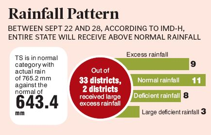 Out of 33 districts, thus far, two districts have seen significant rainfall surplus, nine have experienced rainfall excess, 11 have experienced normal rainfall, eight have experienced rainfall deficiency, and three have experienced significant deficiency throughout the last week. telangana is experiencing a normal monsoon, with actual rainfall of 765.2 mm as opposed to the average of 643.4 mm.
