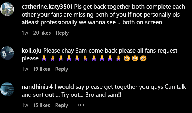 Samantha, on the other hand, has made the decision to delete any post that mentions naga chaitanya from her social media accounts. The comments under naga Chaitanya's two instagram photos on sam drew our notice. Heartfelt requests from fans for the ex-couple to think about a reconciliation are abundant in the comment sections. Fans continue to express a strong wish to see naga chaitanya and samantha together, demonstrating the intensity of their feelings. Most of the remarks were variations on "Get back together please."