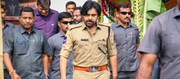 Despite donning a standard police uniform, his buttonless appearance and the necklace of Lord Anjayaneya hanging around his neck have become hot topics. The distinctive black goggles and haircut of pawan kalyan add to his charm. It's impossible to miss the way he enters the set with assurance and his security detail, or the way he nonchalantly leans against an autorickshaw while speaking with the director Harish Shankar.