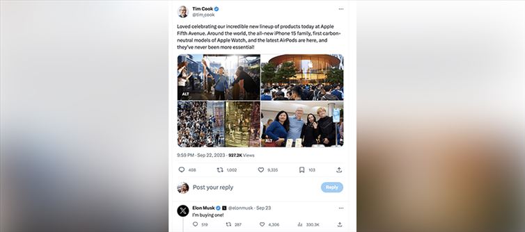 The newest iteration of Apple's well-known flagship smartphone, the iPhone15, is now out, and the giant phone manufacturer is already attempting to generate a lot of excitement for it. Tim Cook, the CEO of apple, in particular, is attempting to draw attention to the device by sharing images from a store in New York where the first US customers are receiving their iphone 15. Elon Musk, a millionaire, now enters the picture.