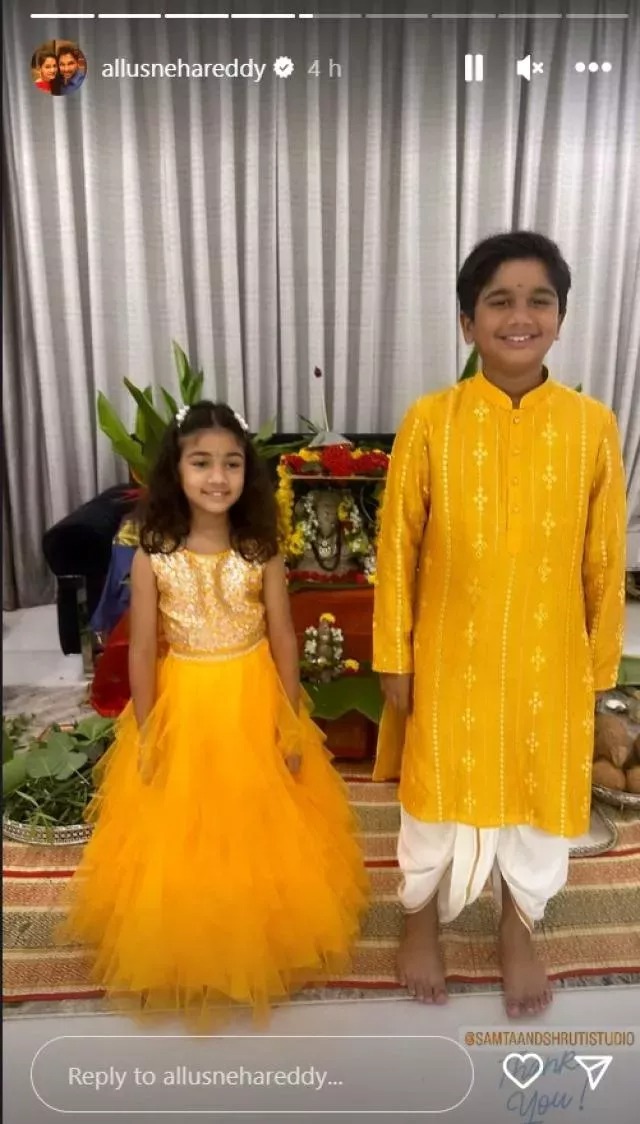 On september 18, 2023, sneha reddy posted some glimpses of the Ganesh puja performed at her home. In one picture we can see that allu arjun was looking very good in a white kurta pajama set. While sneha was looking beautiful in a floral printed saree. Along with this, both her children were also seen twinning in yellow outfits.