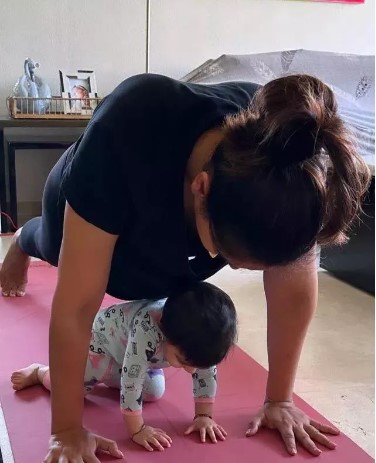 Bipasha Basu shared a photo of herself doing plank yoga with her 11-month-old daughter Devi, the darling looked cute.