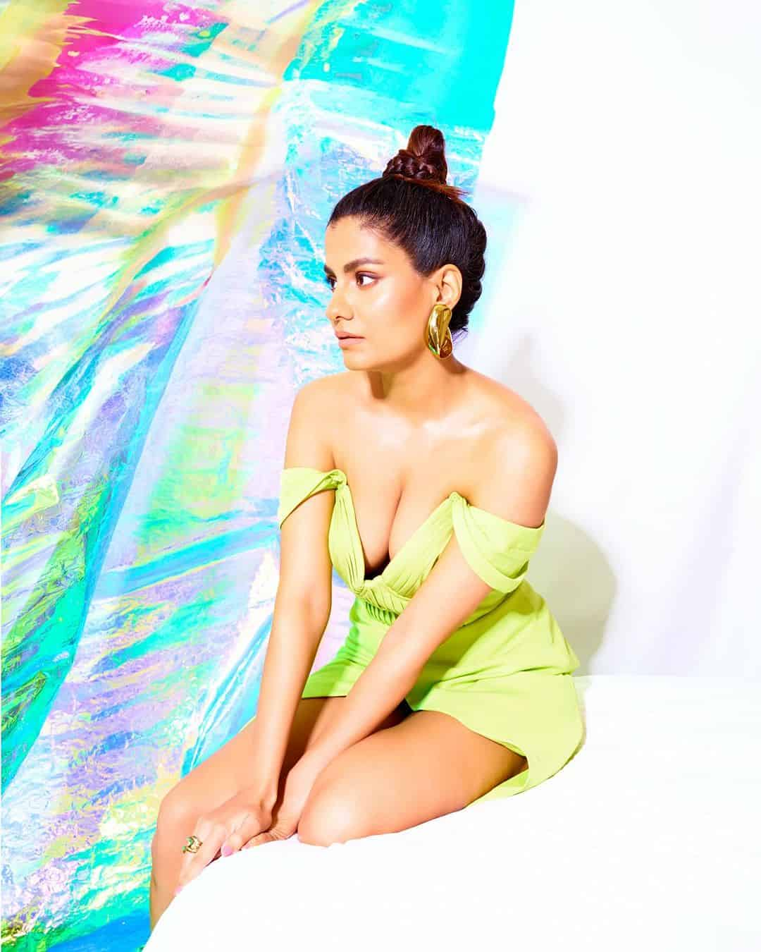 Shreya Dhanwanthary looks stunning in her newest photos, wearing an off-the-shoulder dress in a vivid shade of lime green. Her beauty is perfectly complemented by the lime green clothing, which exudes confidence. Shreya is more attractive and charming because she can pull off such a distinctive, eye-catching ensemble with such ease. Regarding her career, her most recent appearance was in amazon Prime Video's mumbai Dairies: Season 2.