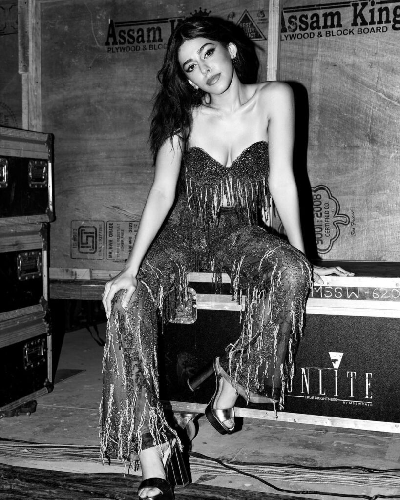 The 'Nocturnal Enigma: The Tassel Tempest Ensemble' from the brand's most recent 'Profusion' collection was worn by Alaya F. Abstract beaded embroidery on her leggings and a matching bralette top complete Alaya F's look. Alaya F took to her instagram handle to treat her fans with her latest photos and captioned her post, "Thrilled to have been the showstopper for @geishadesigns ‘Profusion’ wearing the ‘Nocturnal Enigma: The Tassel Tempest Ensemble’ featuring abstract beaded embroidered pants with a matching bralet top at the Lakme fashion Week 2023."