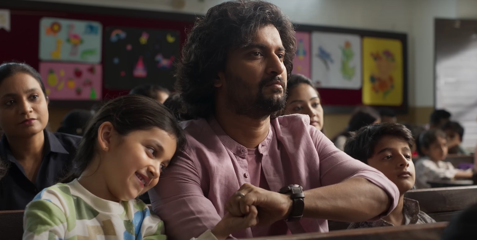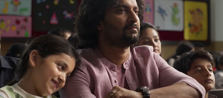 The teaser raises questions about the true relationship between nani and the baby and whether there was any prior connection between nani and Mrinal before the baby's arrival. Making his directorial debut with this film, Souryav appears to have adeptly managed the emotional nuances of the story. It's apparent that this movie is not just another run-of-the-mill father-daughter story. Nani's acting performance is exceptional, marking his return to a poignant character.