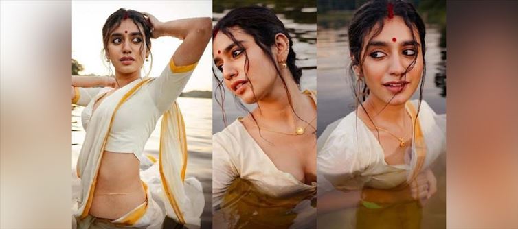 Priya Prakash Varrier, who gained notoriety as the "wink girl," has seen a significant metamorphosis. She recently made a public appearance wearing a spotless white saree, which enhanced her seductive beauty. She radiates the classic elegance of a bygone period as she wears a plunging neckline shirt and a below-the-navel saree drape.