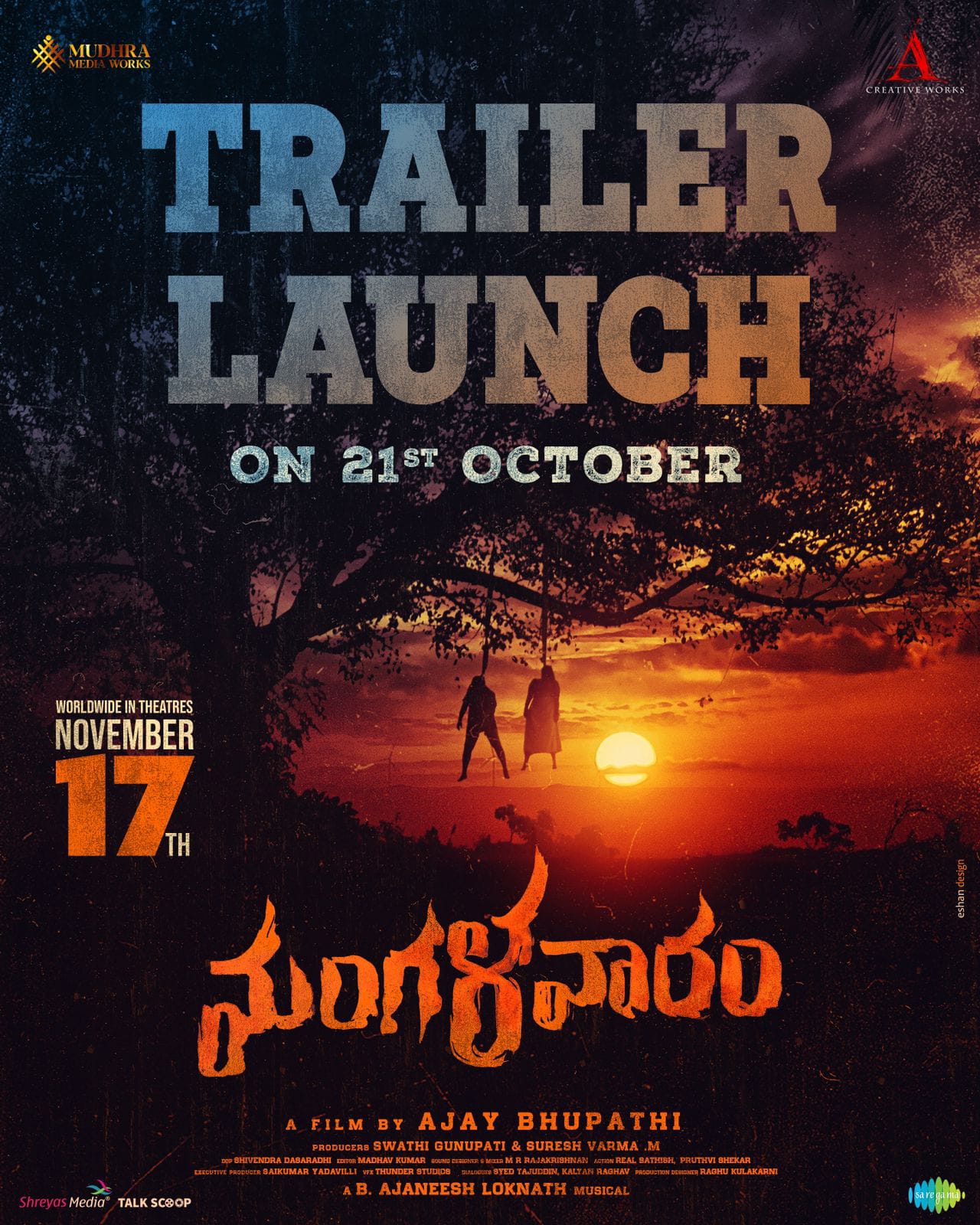 మూవీ ని నవంబర్ 17 వ తేదీన తెలుగు , తమిళ , కన్నడ , మలయాళ , హిందీ భాషలలో పాన్ ఇండియా మూవీ గా విడుదల చేయనున్నట్లు ఈ చిత్ర బృందం చాలా రోజుల క్రితమే అధికారికంగా ప్రకటించింది. ఈ మూవీ కి అంజనేష్ లోకనాథ్ సంగీతం అందిస్తున్నాడు. ఇది ఇలా ఉంటే ఈ మూవీ విడుదల తేదీ దగ్గర పడడంతో తాజాగా ఈ మూవీ మేకర్స్ ఈ సినిమా ట్రైలర్ విడుదలకు సంబంధించిన అప్డేట్ ను ప్రకటించారు. ఈ మూవీ బృందం వారు తాజాగా ఈ సినిమా ట్రైలర్ ను అక్టోబర్ 21 వ తేదీన విడుదల చేయనున్నట్లు అధికారికంగా ప్రకటిస్తూ ఓ పోస్టర్ ను విడుదల చేశారు. ఇకపోతే తాజాగా ఈ మూవీ బృందం వారు విడుదల చేసిన పోస్టర్ సోషల్ మీడియాలో తెగ వైరల్ అవుతుంది. ఇది ఇలా ఉంటే ఇప్పటికే అజయ్ భూపతి , పాయల్ రాజ్ పుత్ కాంబోలో రూపొందిన "ఆర్ ఎక్స్ 100" మూవీ మంచి విజయం సాధించడంతో వీరి కాంబోలో రూపొందుతున్న రెండవ మూవీ కావడంతో మంగళవారం సినిమాపై కూడా ప్రేక్షకుల్లో మంచి అంచనాలు నెలకొని ఉన్నాయి.