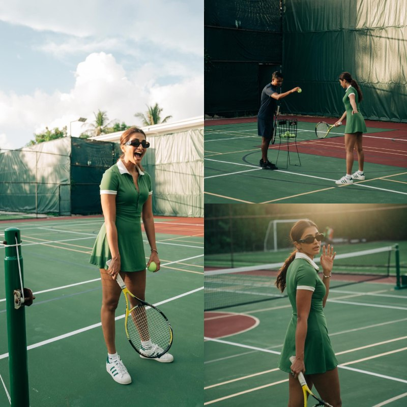 Pooja Hegde is seen in the pictures using a racquet to play tennis. On the tennis court, she is a pro. She seemed too hot to bear in the green minidress, though, especially given the Maldives' sunny climate. Her natural smile makes her appear stunning in the goofy pictures. The diva says in the caption that Federer is the reason for this session. One former tennis player is Roger Federer. For 310 weeks, he held the top spot in the singles rankings, including a record 237 weeks in a row. In the sport of tennis, he has set several records.