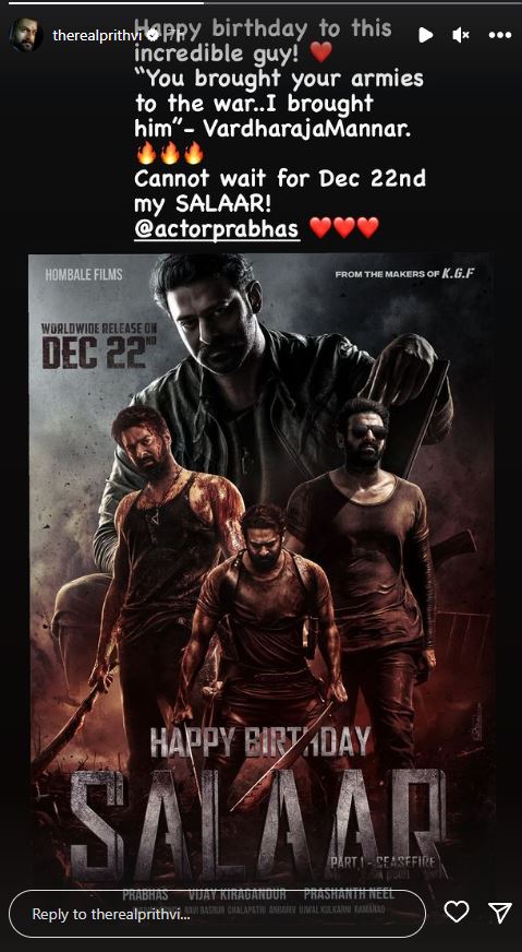 Numerous celebs sent their best wishes to prabhas on his 44th birthday, including prithviraj Sukumaran, venkatesh Daggubati, Roja Selvamani, Sudheer Babu, and vishnu Manchu. prithviraj Sukumaran, who will appear alongside prabhas in "Salaar," wished him a happy birthday on instagram stories. "Happy Birthday to this incredible guy," he said, sharing a poster of prabhas from the movie. You arrived at the battle with your armies. I delivered VardharaMannar (emojis of fire) to him. Can't wait for my Salaar on december 22nd.