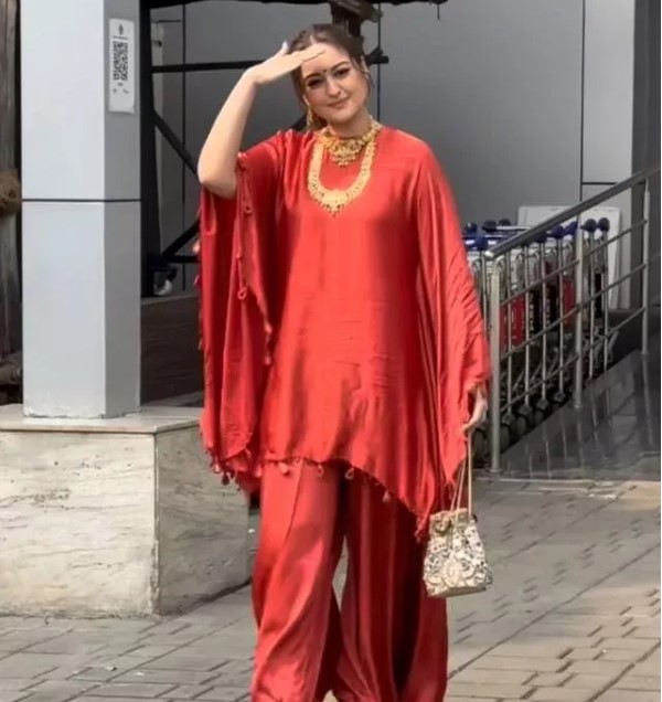 Sonakshi Sinha was spotted at kerala airport for the Kalyanaraman navratri event. During this, she was seen in a red-colored Sharara set. She completed her look with golden jewelry. A potli bag was adding the oomph factor to her look.