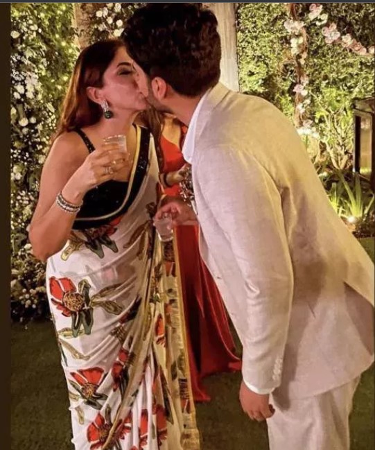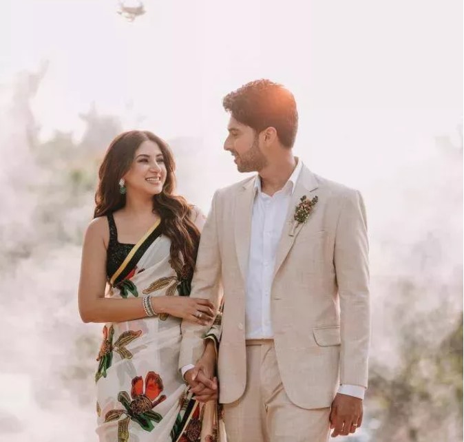 On october 23, 2023, Aashna Shroff posted two pictures from her engagement ceremony on her instagram handle. In the first picture, we can see Aashna posing with Armaan. The bride-to-be had chosen a beautiful cream-tone saree with a red floral print on it for the engagement. She styled it with a sleeveless, black shiny blouse.