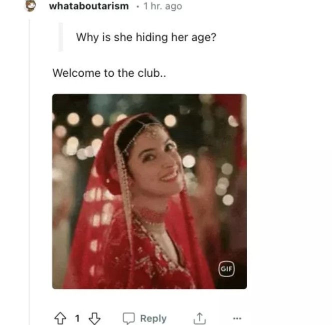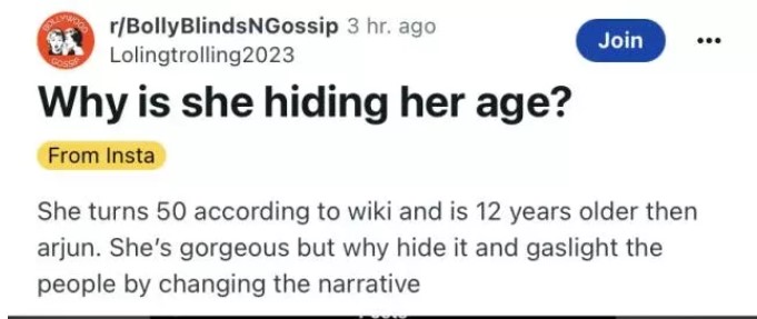 The user wrote, "According to Wiki (Wikipedia), she is 50 years old and 12 years older than Arjun. She is very beautiful, but why hide it (age) and shock people by changing the story."