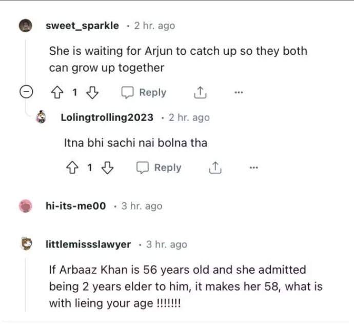 As soon as the post was uploaded, netizens flooded the comment section. One user took a dig at the age gap between her and her boyfriend and wrote, "Heard a rumor, don't know if it's true or not, she is waiting for arjun to turn 48, just 8 more years left." !” Another took a dig at malaika being two years older than Arbaaz and said, "If arbaaz khan is 56 and she has accepted that she is 2 years older than him, then that makes her age 58, then your age." What does it mean to lie about."