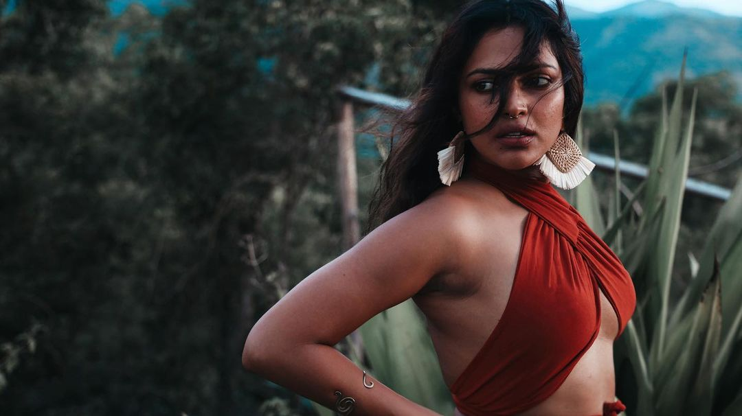 Amala Paul radiates flair and sophistication in these pictures while sporting a vivid multicoloured halter neck jumpsuit. The actress confidently creates several positions with a luscious bouquet of leaves. With her hair styled gracefully in a high ponytail, she wears little makeup that lets her natural beauty take centre stage.