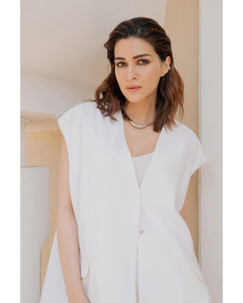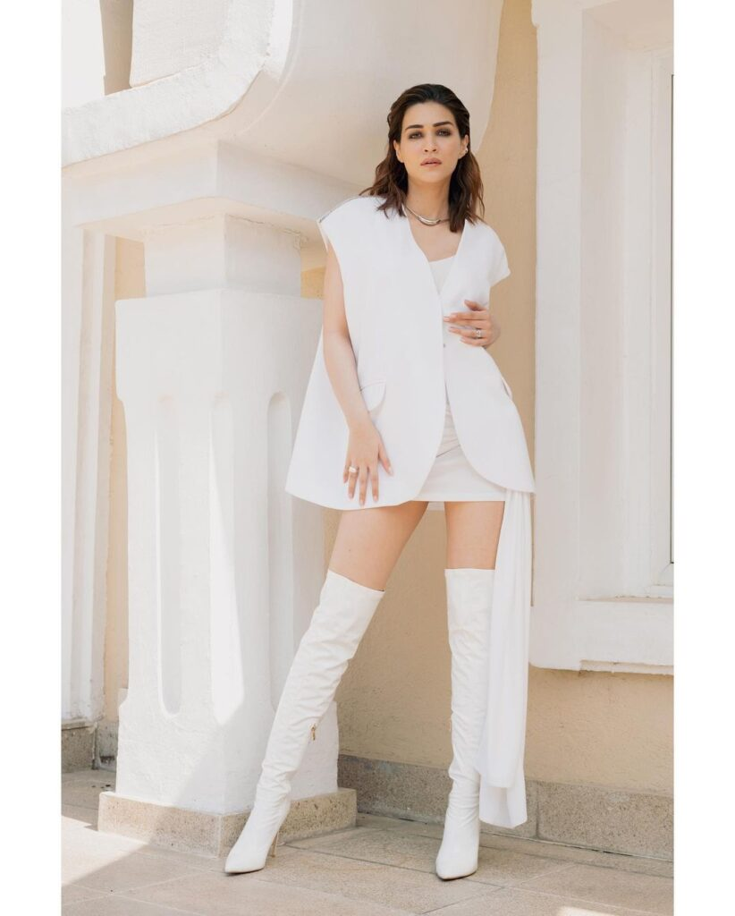We frequently believe that white cannot be styled with white. Kriti, however, disproved it by dressing in a white dress and matching white knee-high boots. She improved it by adding a sleeveless jacket on the top. She added little stud earrings and a bold necklace to complete her ensemble. Kriti's all-white ensemble is the ideal seasonal urban style.