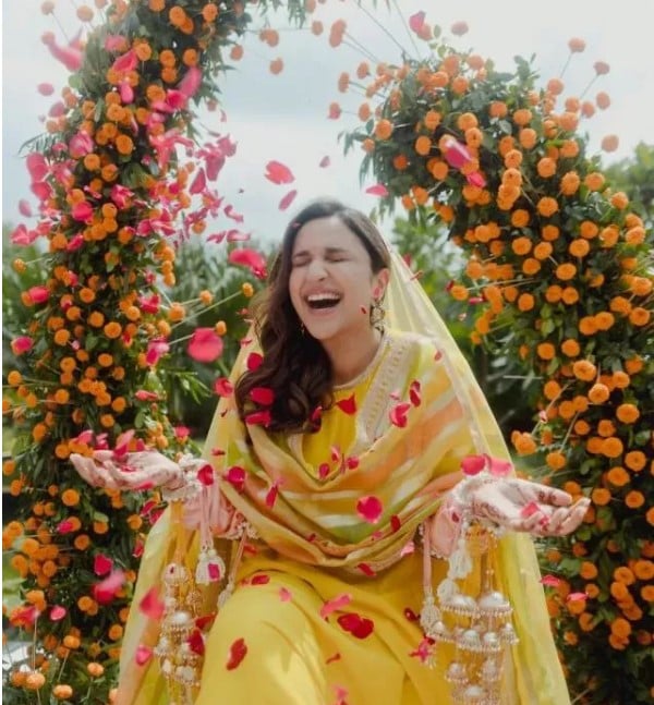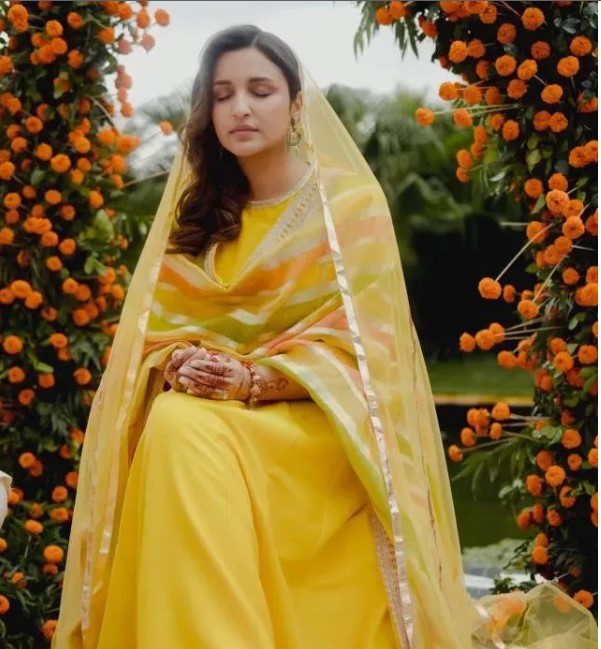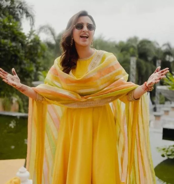 On october 26, 2023, parineeti chopra shared some wonderful photos of her Chuda ceremony from her insta account, in which Parineeti was looking very happy. For her ceremony, Pari had chosen a yellow-colored Anarkali suit with lace detailing, which she styled with matching churidar pajama and multicolored dupatta. She completed her look with minimal makeup, earrings, open locks, and shoes.
