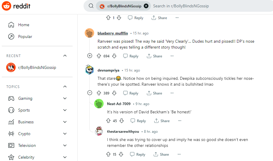 Ranveer and Deepika’s revelation has ignited curiosity amongst netizens about whether they were in a “situationship.” One Reddit user wrote, “Ranveer was pissed! The way he said ‘Very Clearly’… Dudes hurt and pissed!! DP’s nose scratch and eyes telling a different story though!” Another one commented, “That stare lol. Notice how on being inquired, deepika subconsciously tickles her nose- there’s your lie spotted.”
