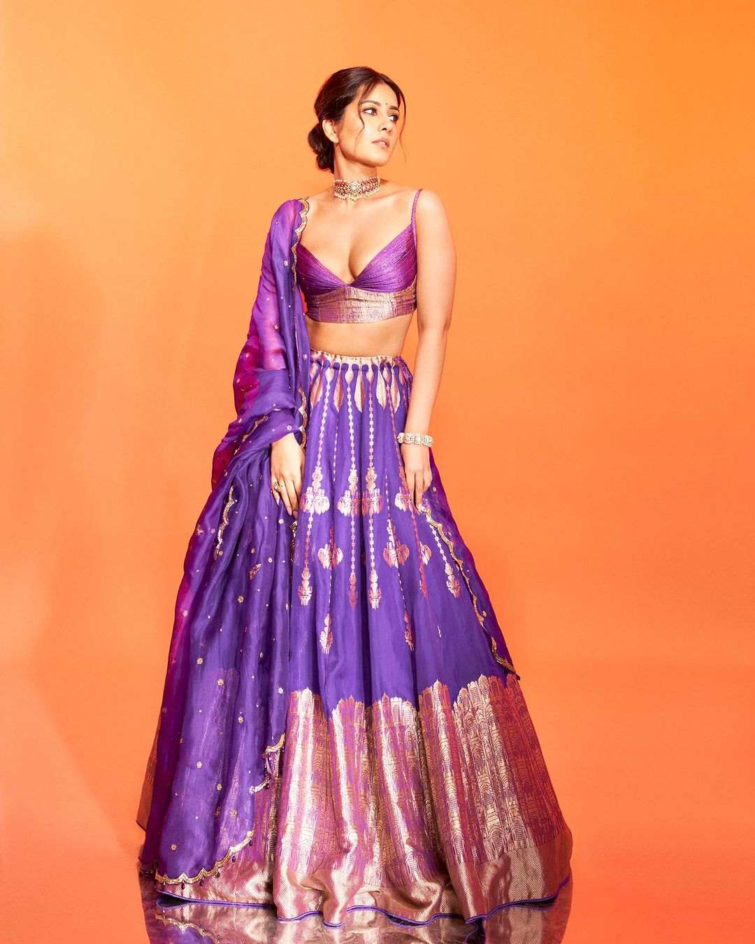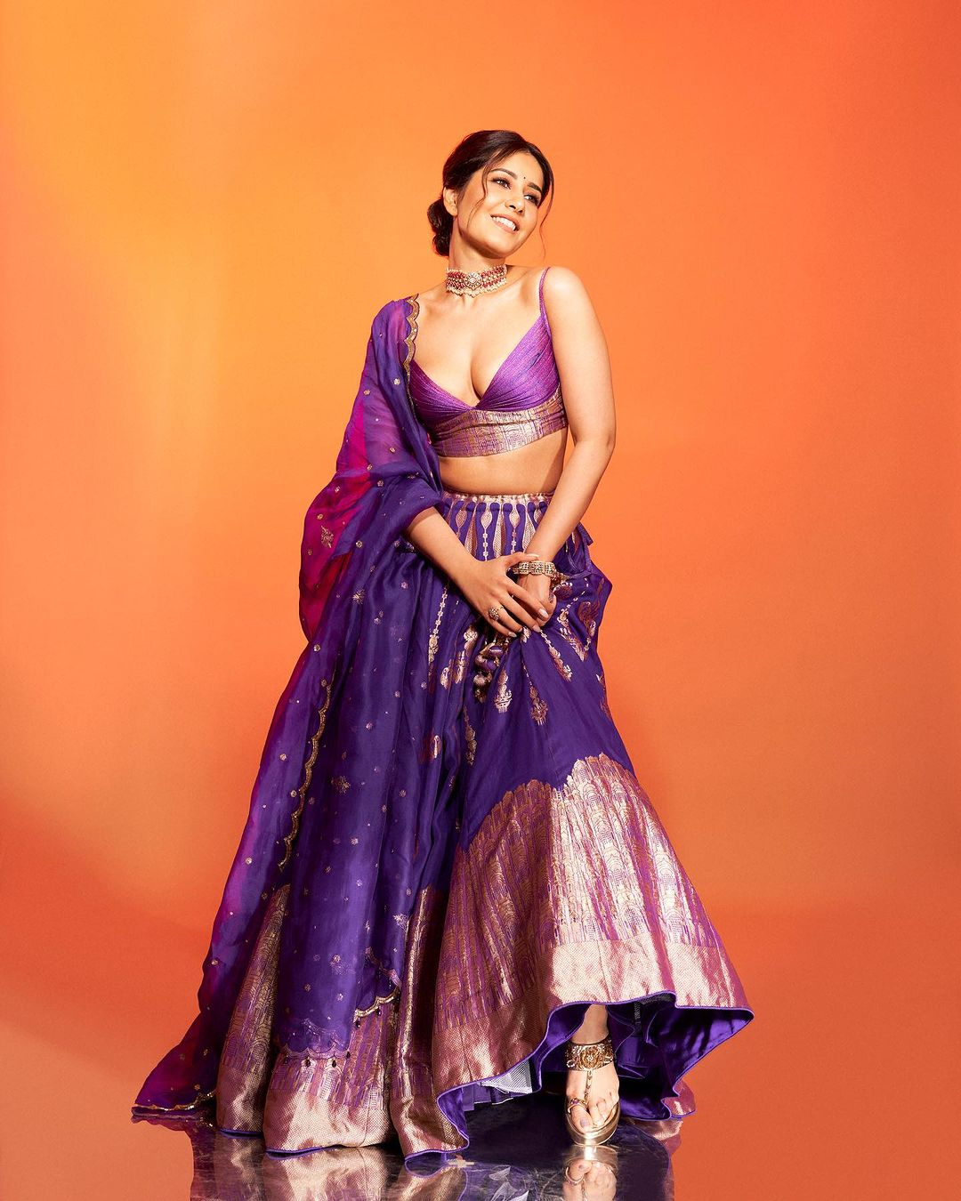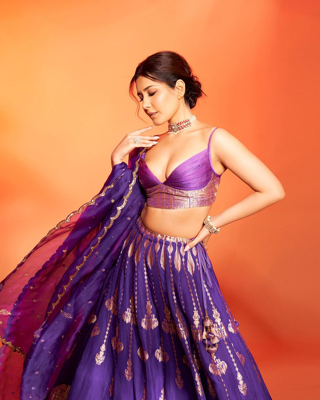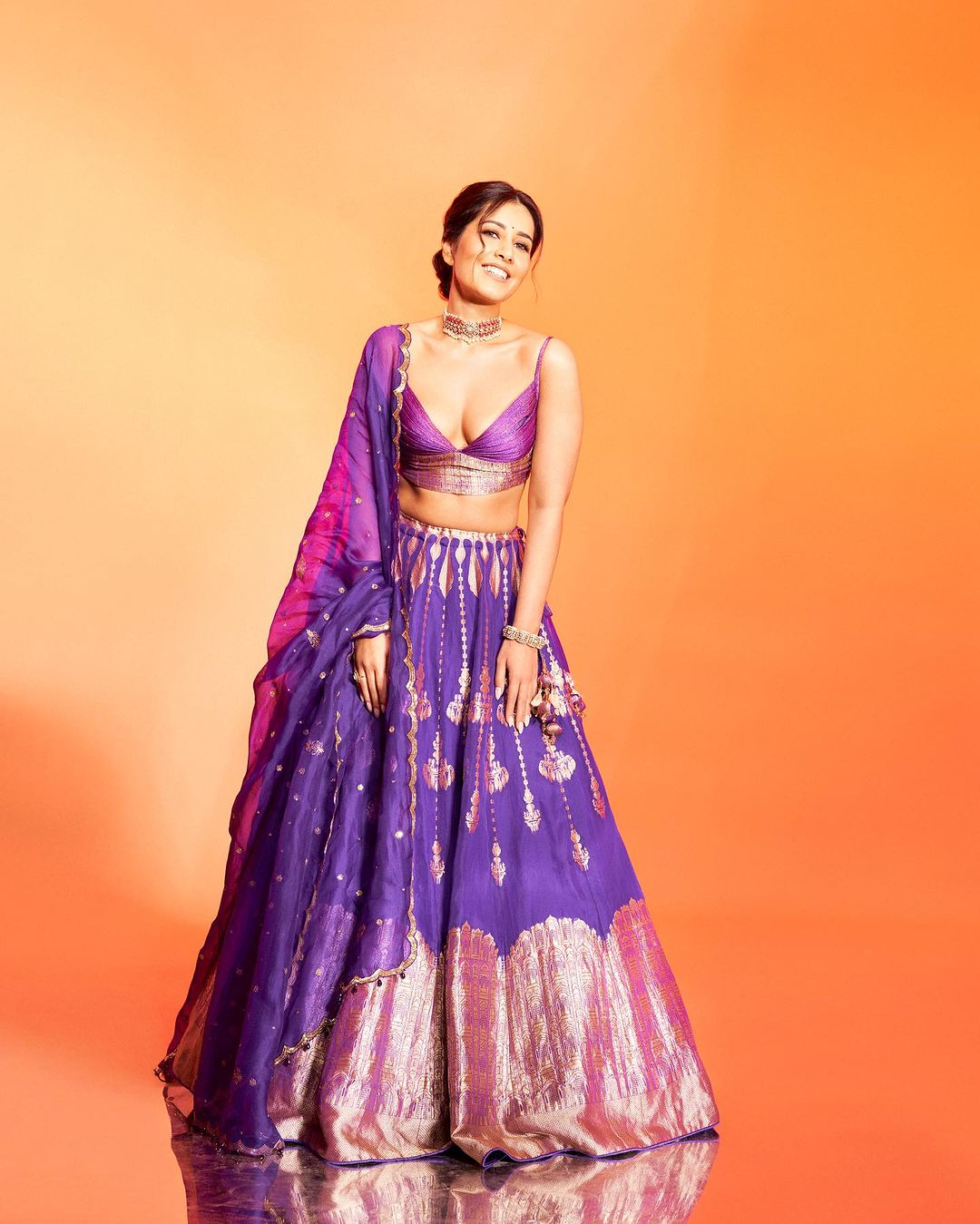 Raashii's purple lehenga choice accentuated her grace and poise and was a fantastic match for her skin tone. She looked stunning thanks to the deep-necked shirt and the elaborately carved choker necklace, which gave her an air of glitz. Her contagious grin took the stage thanks to the classic bun hairdo and the simplicity of a bindi, which accentuated her innate attractiveness. Raashii's ability to skillfully combine traditional components with modern style won her accolades from fans.